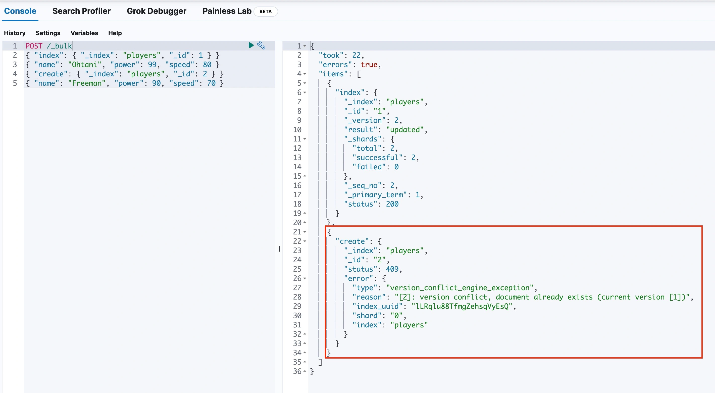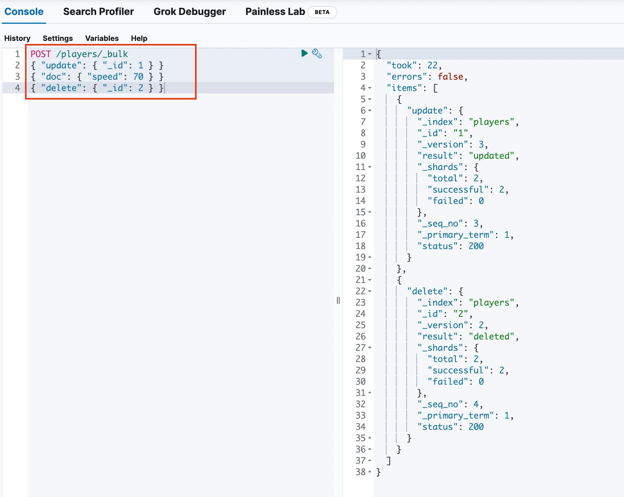 和 上一篇文章 中 update_by_query 的方式一樣,每一個動作本身並不會影響到其他的動作,也就是說其中一個發生錯誤了,其他的還是會繼續執行,直到最後 ES 會把所有更新的細節回傳給你,接著你再來決定要怎麼做。