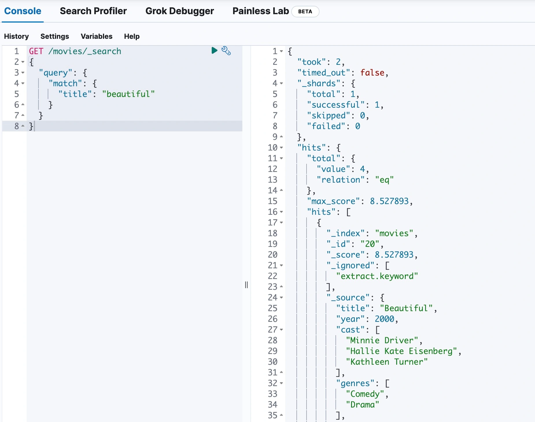 接著會得到 4 筆電影資料,title 都有包含 beautiful 的單字。