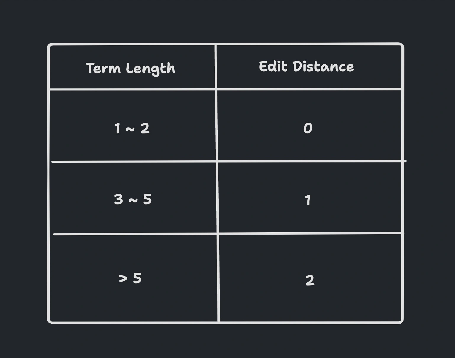當單字的長度在 1~2 之間,代表的像是 ok 或是 hi 這樣的單字,當使用者打錯時,可以接受的處理次數是 0,也就是不會去進行模糊搜尋。