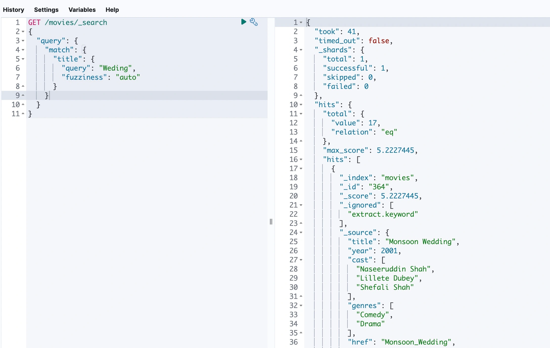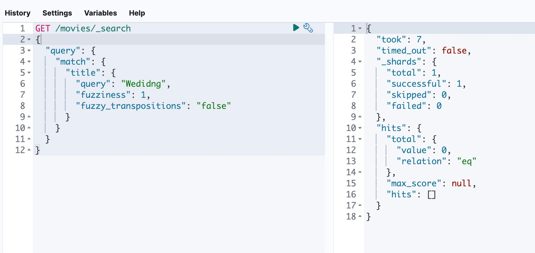 舉例來說,Wedding 以及 Wedidng 在剛剛提到 fuzziness 內需要做 2 次的處理,才可以配對成功。