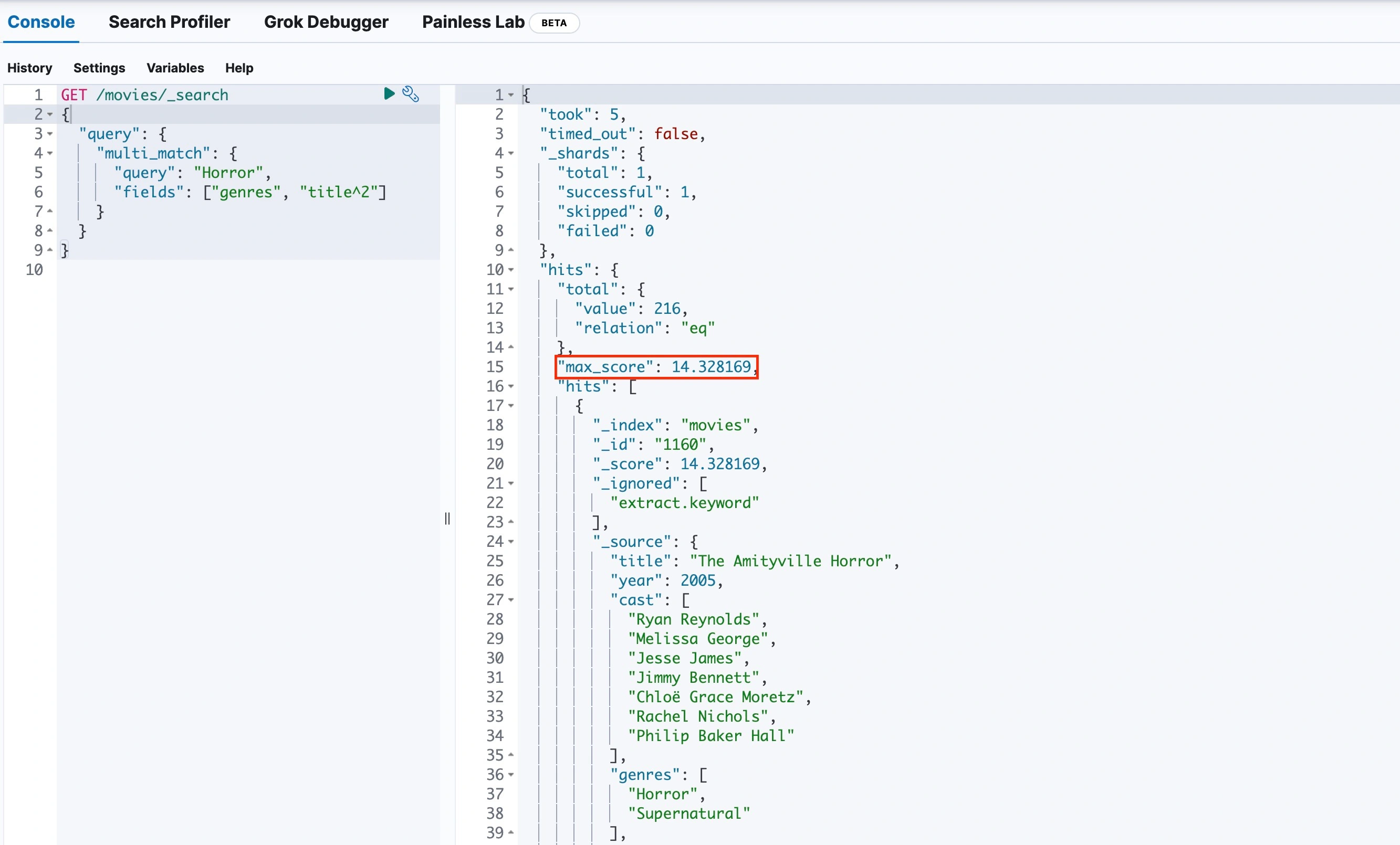 但這邊我們希望可以讓更多 title 中含有 Horror 的資料排名往前,也就是我們希望可以 boost 一下這個 title 的欄位,我們希望它變得更重要,我們可以怎麼做呢?