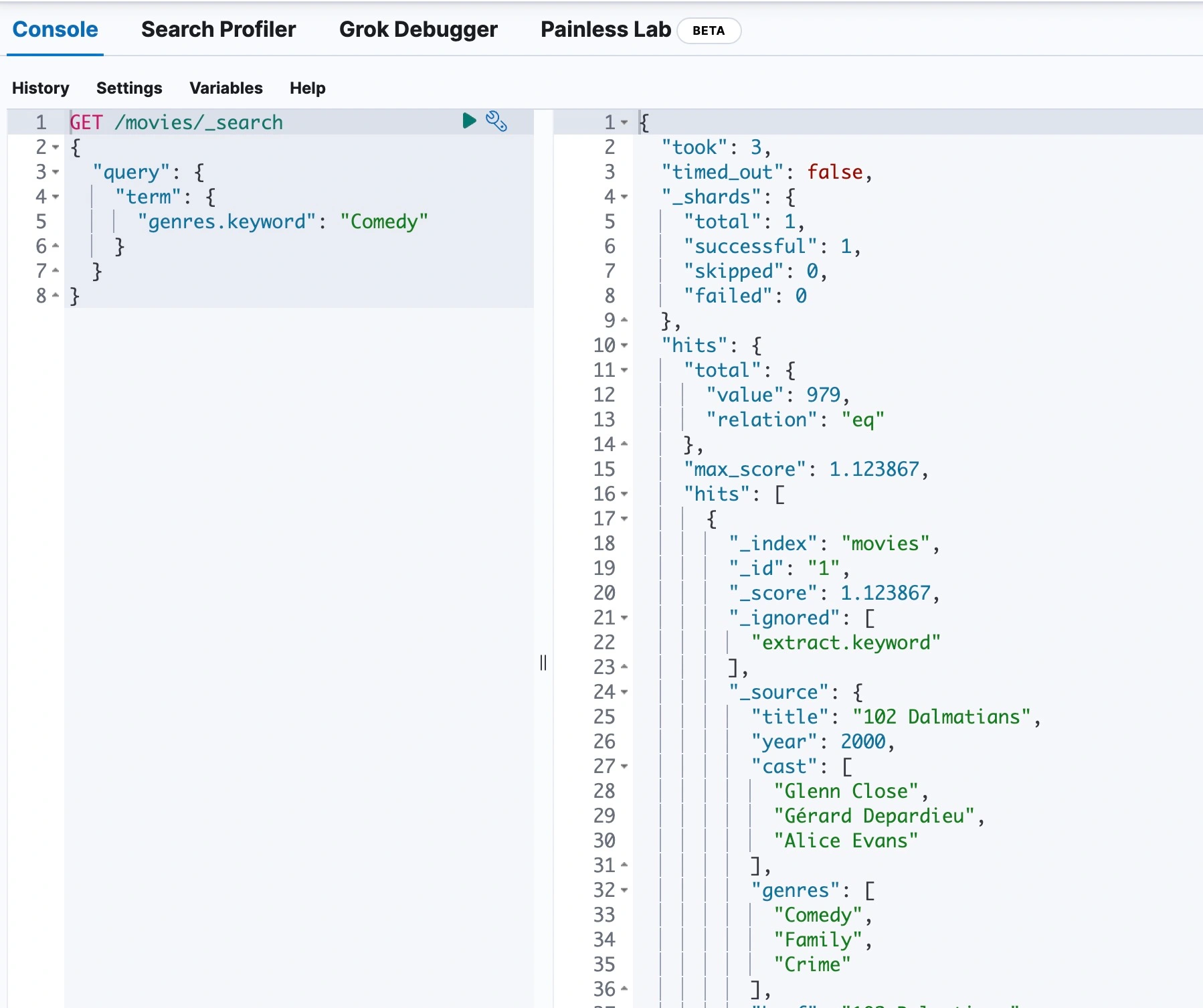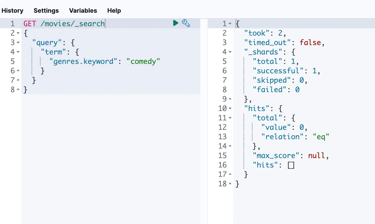 所以這邊搜尋中的 comedy 確實沒辦法在 inverted indices 中找到和 comedy 相符的文件,因為當初這個欄位是以 keyword 的資料類型儲存,而且儲存的內容本身是 Comedy 大寫的格式,所以一定找不到。