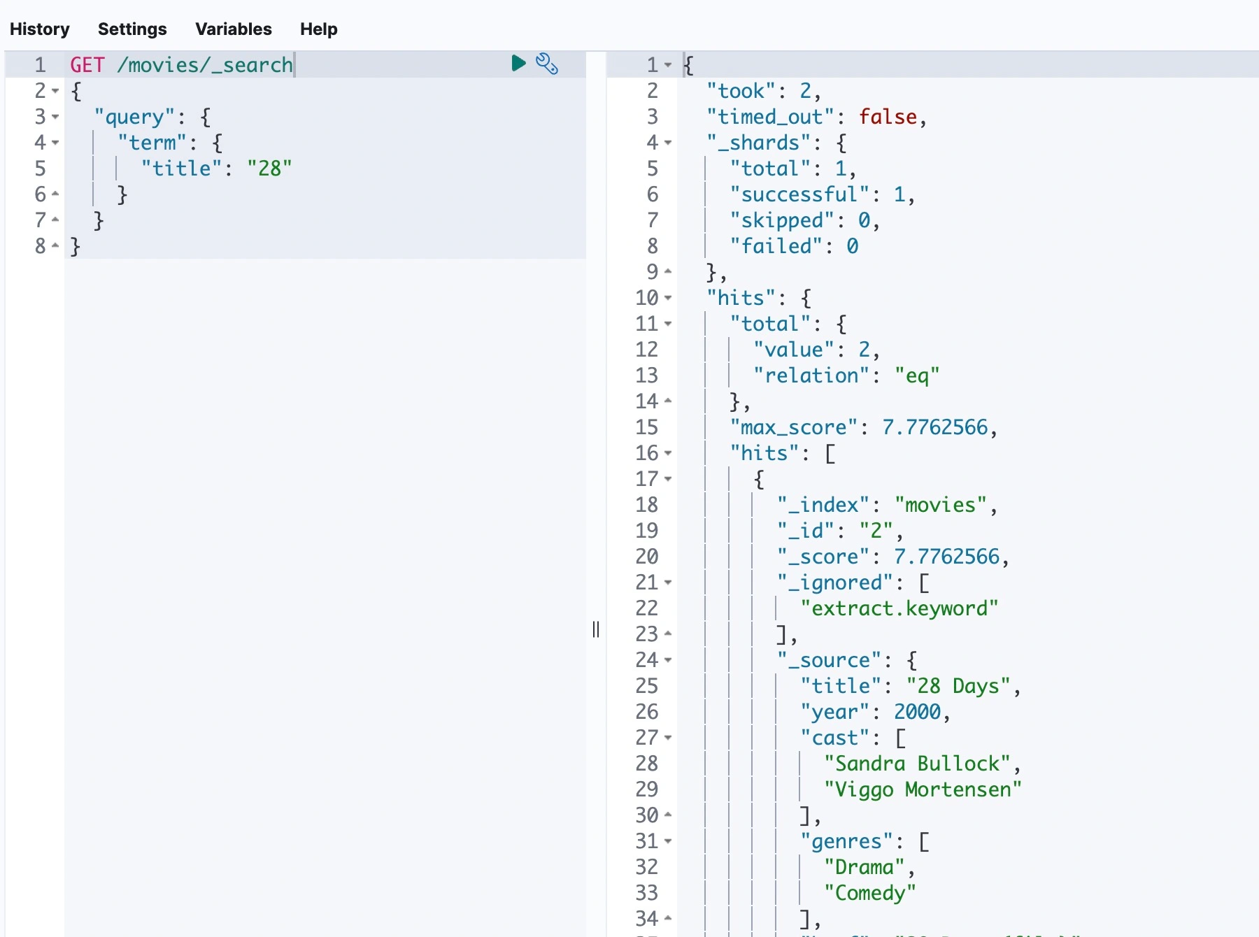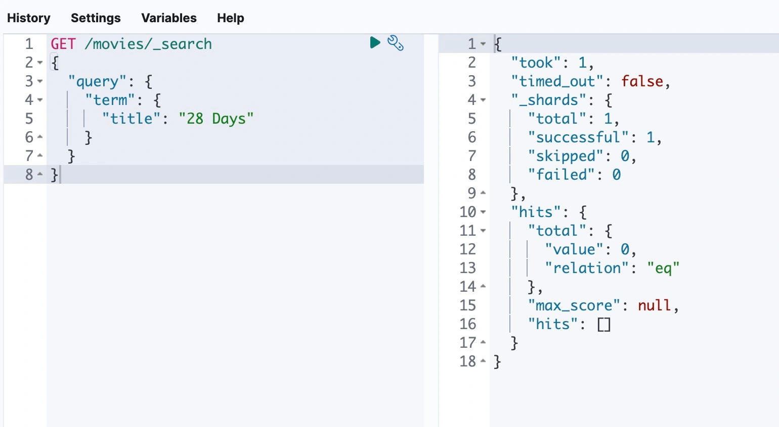 而搭配上我們說的 term level 並不會對搜尋的單字進行分析,所以是直接用 28 Days 這樣的 key 下去找,當然找不到囉!