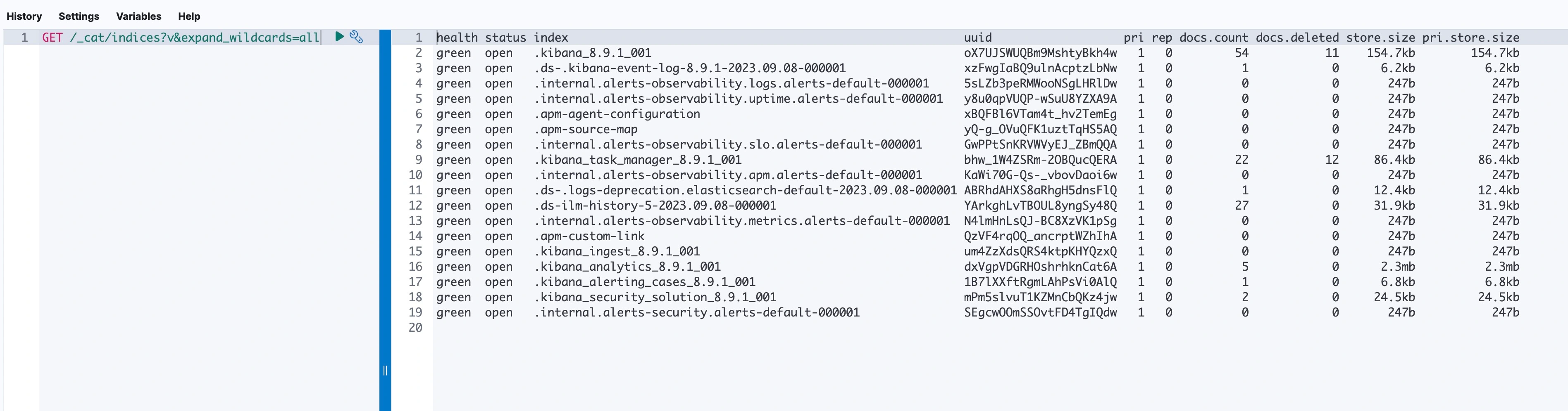 但還是可以查看一些有趣的東西,使用 GET /_cat/indices?v&expend_wildcard=all 就可以列出叢集的基本索引:
