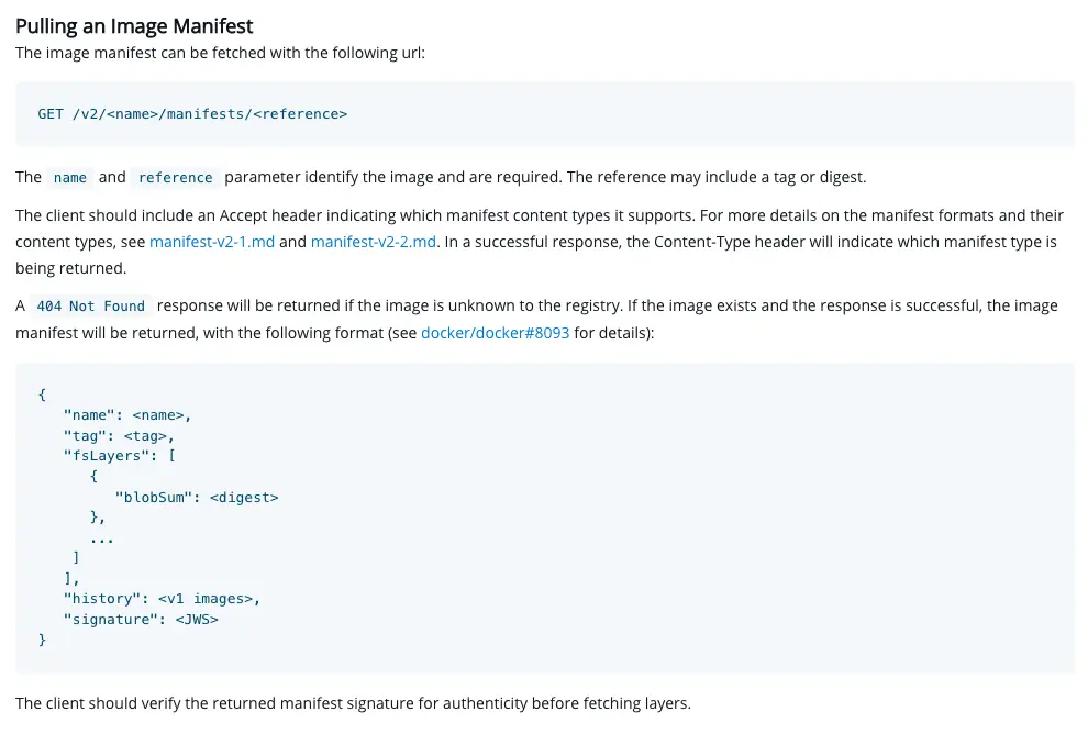 所以我們需要找到另一個可以得到 digest 的 API 才能回來刪除掉這個映像檔,透過閱讀官方的文件可以得知下面這個 API 能夠得到映像檔的 manifest。