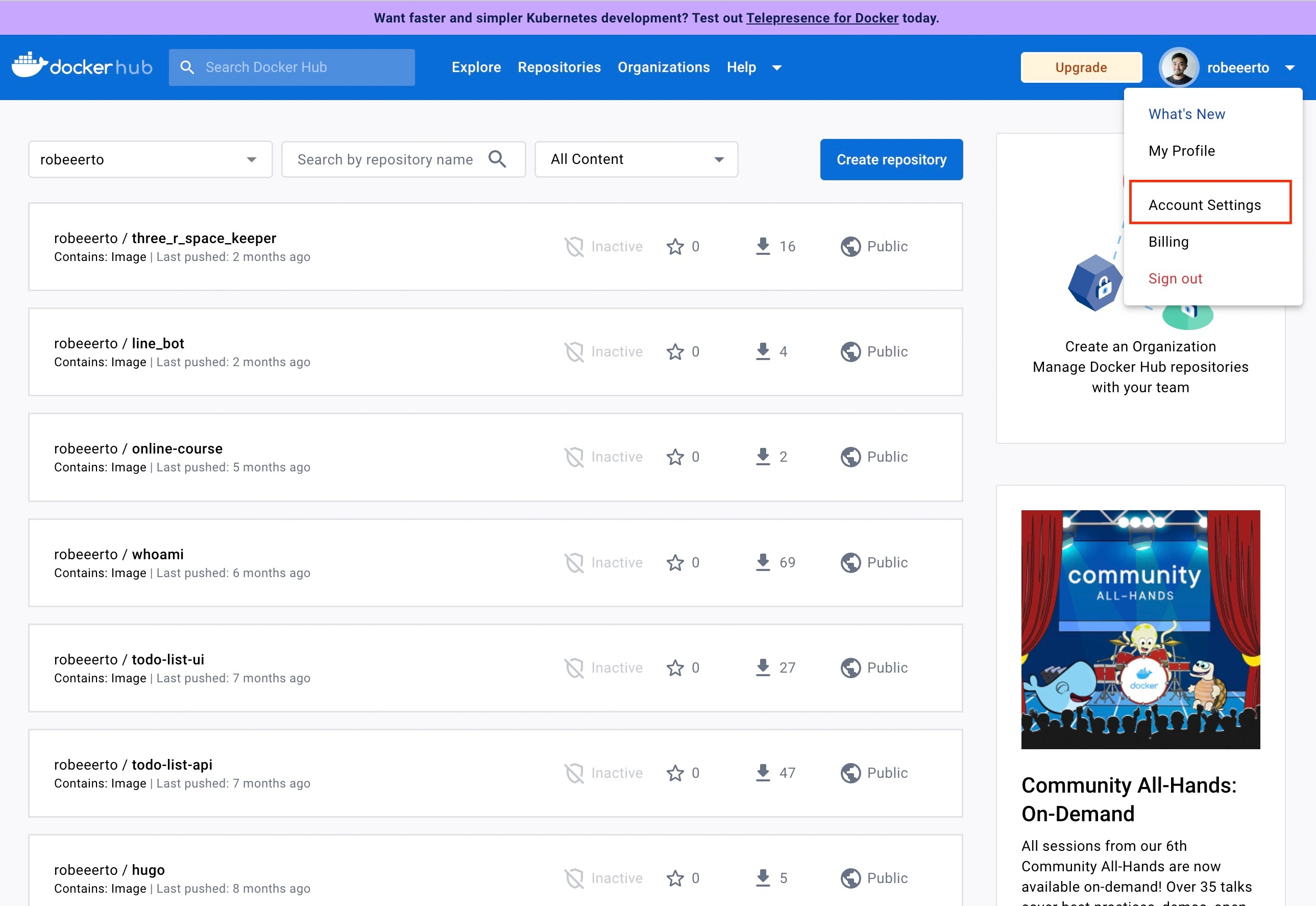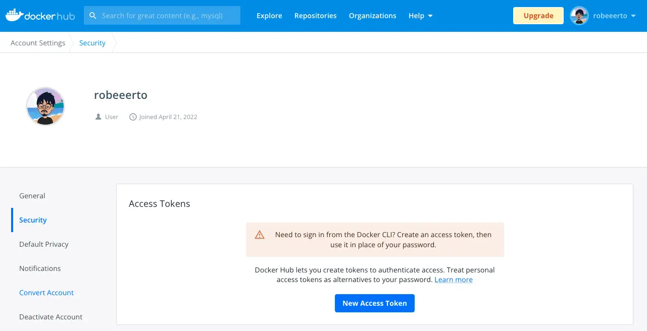 叫你去申請個人的 Token 來進行登入,這時候我們打開 DockerHub 點擊大頭貼並進入 Account Setting。